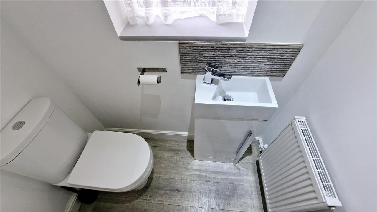 With a uPVC double glazed window to the side elevation, white low level WC and vanity sink with chrome waterfall mixer tap, wall mounted radiator and ceiling light point.