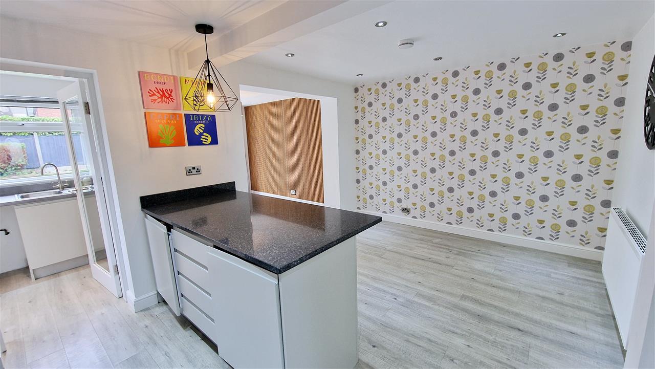 View from the open kitchen into the dining area housing a ceiling light point directly over the worktop/breakfast bar area housing the integrated separate fridge and freezer.