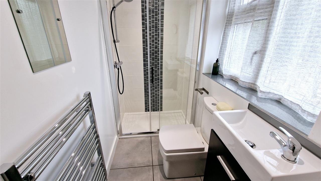 Having a uPVC double glazed window to the side elevation and fitted with a double shower and sliding glass doors, T Bar mains water shower fitment, low level white WC and vanity sink with a chrome mixer tap, heated chrome towel rail, extractor fan and ceiling light point.